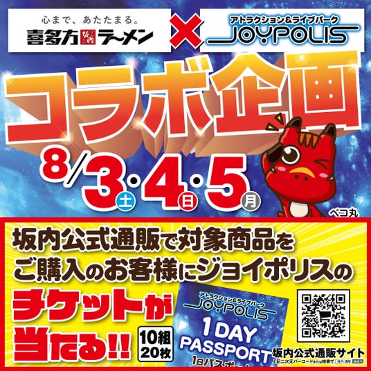 「喜多方ラーメン坂内」×「東京ジョイポリス」コラボレーション坂内公式通販で3日間特別セットを販売!ご購入のお客様を対象に抽選で10組20名様に東京ジョイポリスチケットが当たるキャンペーン開催