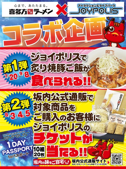 ラーメンチェーン「喜多方ラーメン坂内」をはじめ、アジアン料理「88亞細亞(ハチハチアジア)」や「ヴェトナム・アリス」など、国内外で多様なジャンルの飲食店事業を手掛ける株式会社麺食(本社:東京都品川区、代表取締役社長:中原 誠) は、CAセガジョイポリス株式会社(本社:東京都品川区、代表取締役:吉本 武)が運営する「東京ジョイポリス」とのコラボレーション企画を開催いたします。東京ジョイポリス施設内での人気メニュー販売や、坂内公式通販で特別セット企画をお楽しみください。