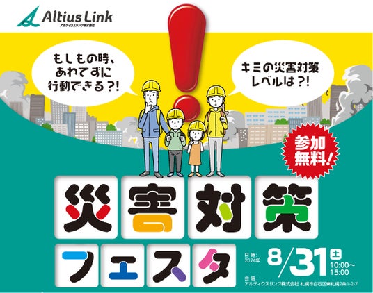 アルティウスリンク株式会社(所在地:東京都新宿区、代表取締役社長:網野 孝、以下 アルティウスリンク)は、BPO・コンタクトセンター拠点の「Polaris_Sapporo(ポラリスサッポロ)」において、近隣住民の皆様向けに地震・災害が起きた時に役立つ知識を楽しみながら身につけられる「災害対策フェスタ」を8月31日(土)に開催いたします。