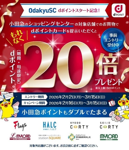 株式会社NTTドコモ(以下、ドコモ)は、ドコモが提供するポイントサービスdポイントが、2026 年2月2日(月)から小田急の大型ショッピングセンター8施設の対象店舗(※1)でご利用可能になることを記念して、通常の20倍のdポイント(期間・用途限定)(※2)を進呈する「小田急のショッピングセンターdポイントスタート記念!もれなく20倍キャンペーン」(以下、本キャンペーン)を2026年2月16日(月)から3月15日(日)までの期間で開催(※3)いたします。本キャンペーンの事前エントリーは2026年2月2日(月)から開始いたします。