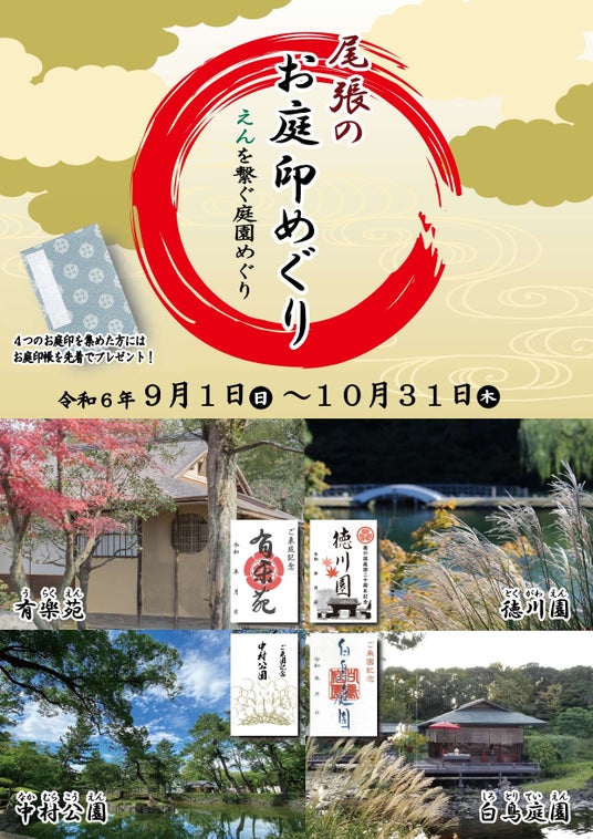 名古屋鉄道が運営する日本庭園「有楽苑(うらくえん)」は、中村公園・徳川園・白鳥庭園とコラボレーションし、4施設で販売している「お庭印(にわいん)」を巡って集める「尾張のお庭印めぐり」を実施します。