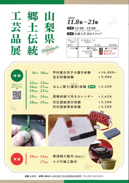 今年度も、県内外の多くの方に山梨県郷土伝統工芸品を知ってもらう機会とするとともに、首都圏への販路拡大を図るため、全国の伝統工芸品を広く取り扱っている「伝統工芸 青山スクエア」において「山梨県郷土伝統工芸品展」を開催します。