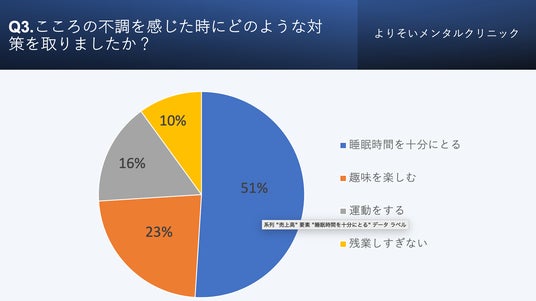 Q1で「とてもある」「ややある」と答えた新社会人に、「Q3.こころの不調を感じた時に対策を取りましたか?」とアンケートをとりました。