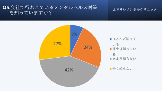 会社が行なっているメンタルヘルス対策について知っているか聞いたところ「あまり知らない」「全く知らない」と回答した新社会人は合計で約7割にのぼりました。