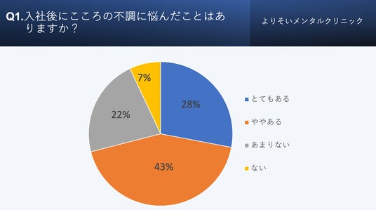 「とてもある」と回答した方が28%、「ややある」と回答した人が43%でした。合わせて71%の新社会人が入社後にこころの不調を抱えていることがわかります。