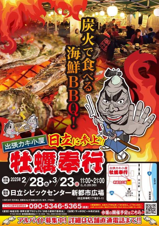 宮城県石巻の牡蠣をセルフ炭火焼き(海鮮BBQ)で楽しむ「出張カキ小屋 牡蠣奉行」(TEL 090-5346-5365)が2月28日、日立シビックセンター(茨城県日立市)新都市広場に期間限定オープン。