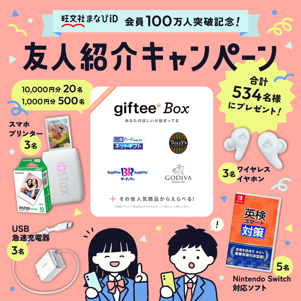プレゼントは260組(520名様)にデジタルギフト「giftee Box(R)」、さらに14名様にスマホプリンタやワイヤレスイヤホンなどの豪華賞品が抽選で当たります。