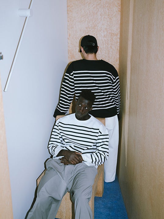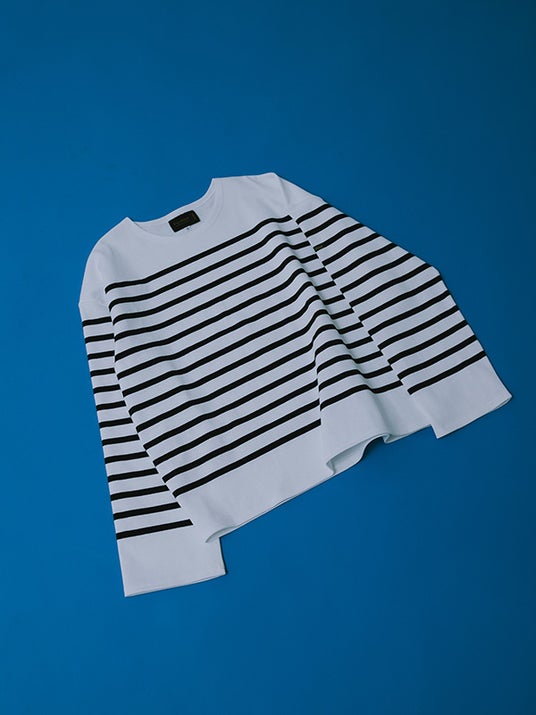 また一からパターンを引いたシルエットも特徴。襟の開きもいわゆるボートネックではなく、ボートネックとクルーネックの中間に設定。ゆとりのある、でもどこか両ブランドの持つ清潔感や上品さがしっかりと出ている1枚です。