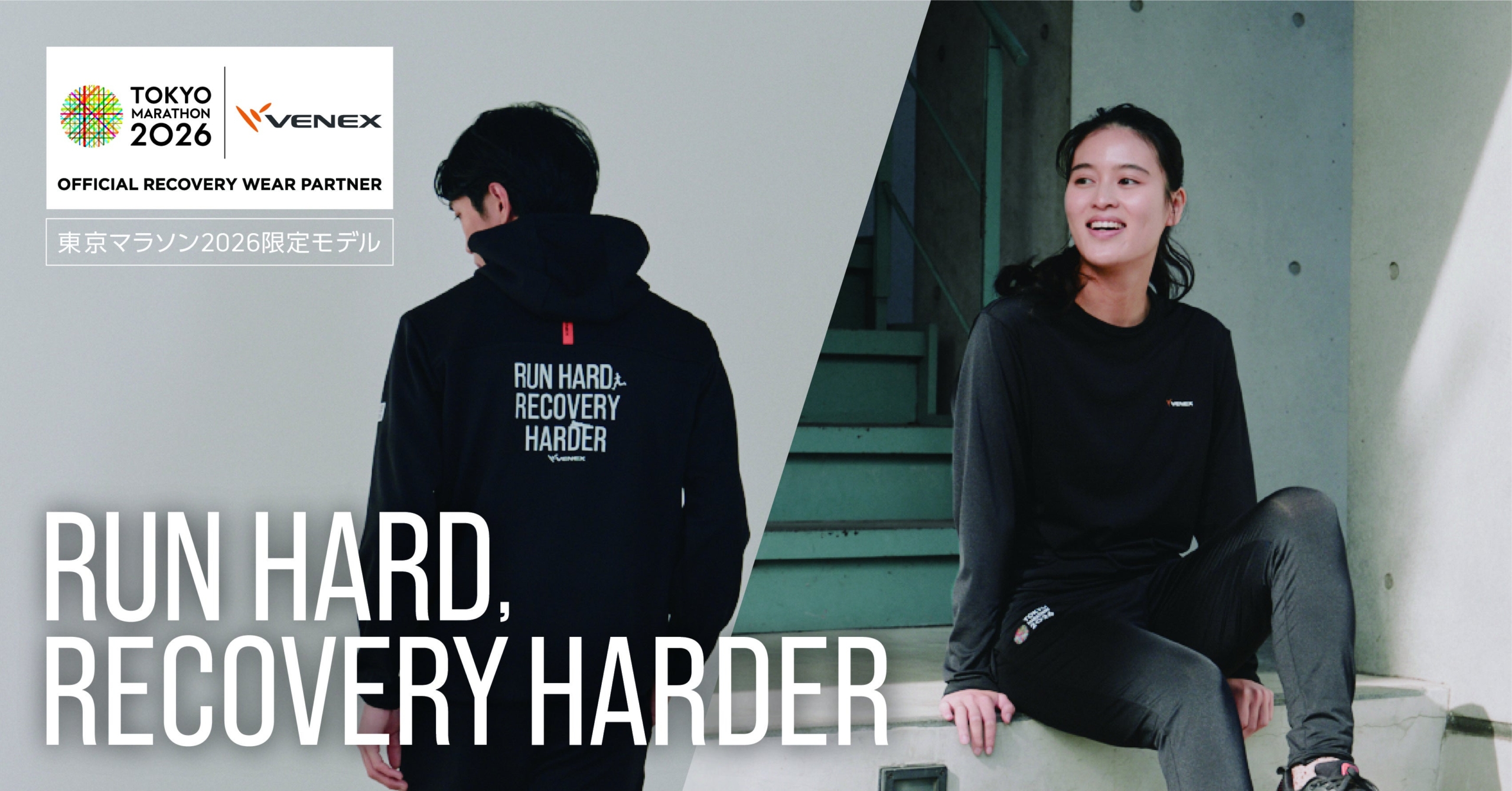 デザインは、「東京マラソン2026」のロゴデザインと、VENEXが掲げる応援メッセージ「RUN HARD, RECOVERY HARDER」のデザインの2種類。それぞれ、ショートスリーブロングパンツの上下セットと、ロングスリーブロングパンツの上下セットをご用意しています。