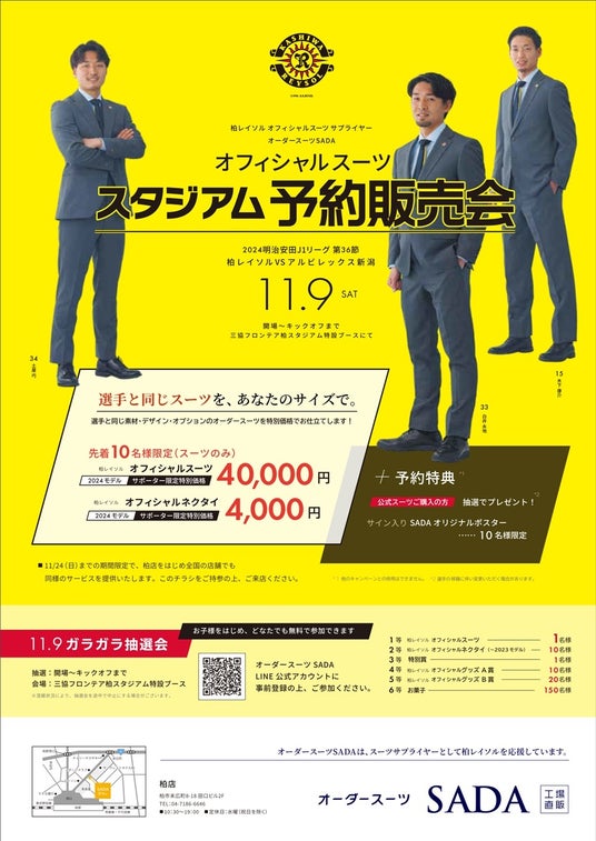 「柏レイソル」 オフィシャルスーツサプライヤー オーダースーツSADAオフィシャルスーツ スタジアム予約販売会11月9日(土)開催