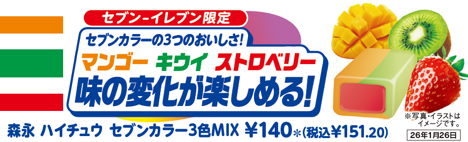 株式会社セブン‐イレブン・ジャパン(本社:東京都千代田区、代表取締役社長:阿久津 知洋)は、森永製菓株式会社(本社:東京都港区、代表取締役社長 COO:森 信也)の「森永 ハイチュウ セブンカラー3色MIX」を、全国のセブン‐イレブンにて1月13日(火)より順次発売します。  「ハイチュウ」発売50周年を記念したコラボレーション企画として、セブン‐イレブンのスタッフを対象に「今、一番発売して欲しいハイチュウ」を決めるアンケート(※1)を実施し、12月9日(火)より第1弾の「ギャラクシーアップル味(※2)」を販売開始しました。そしてこの度、同アンケートで上位に選ばれ、スタッフからの商品化を望む声が大きかったフレーバーから、待望の限定ハイチュウ第2弾として、セブンカラーにちなんだ、マンゴー・キウイ・ストロベリーのセブンカラー3色MIXが登場します。フルーツのジューシーな味わいを一粒でお楽しみいただけます。 ※1 従業員アンケート(2025年3月実施、n=12,594)  ※2 「ハイチュウ<ギャラクシーアップル味>」について: https://prtimes.jp/main/html/rd/p/000000569.000155396.html マンゴー・キウイ・ストロベリー、3つの味を一粒で楽しめる「ハイチュウ」 ■森永 ハイチュウ セブンカラー3色MIX 価格:140円(税込151.20円) 発売日:1月13日(火)~順次発売 販売エリア:全国 メーカー:森永製菓株式会社 噛むほどに広がる、フルーツのジューシーな味わい! ※画像はイメージです セブン‐イレブンのコーポレートカラー(セブンオレンジ・セブングリーン・セブンレッド)をイメージした、人気のフルーツフレーバー<マンゴー・キウイ・ストロベリー>を一粒に凝縮しました。ハイチュウ独自の噛み応えのある食感で、噛めば噛むほどフルーツのジューシーな味わいが広がります。 セブン‐イレブンのスタッフが選んだ、新フレーバー第2弾! 本商品は、ハイチュウ発売50周年を記念したコラボレーション企画から誕生しました。セブン‐イレブンの従業員12,594人を対象に「今、一番発売して欲しいハイチュウ」を決めるアンケートを実施した結果、「セブンカラー3色ミックス」が上位にランクライン。第1弾のギャラクシーアップル味に続く、セブン‐イレブン従業員お墨付きの新フレーバー第2弾として登場します! 第1弾<ギャラクシーアップル味>も発売中 ■ハイチュウ<ギャラクシーアップル味> 価格:140円(税込151.20円) 発売日:発売中 販売エリア:全国 メーカー:森永製菓株式会社 青りんごの爽やかな酸味をベースに、ハチミツのような甘みとスパイスのような香りがアクセントとなった、宇宙(ギャラクシー)をイメージした奥深く、やみつきになる味わいをお楽しみいただけます。 担当者コメント セブン‐イレブンカラーをモチーフにした特別なハイチュウをお届けできることを、大変嬉しく思います。本商品は、前回に続き、セブン‐イレブン従業員のアンケートで上位に選ばれたフレーバーを商品化した第2弾です。マンゴー・キウイ・ストロベリーの3つの味が一粒でシンクロする新感覚のジューシーな味わいをお楽しみください。忙しい毎日の中で、セブン‐イレブンでしか手に入らないこの特別なハイチュウが、皆様の小さなご褒美となり、明日への活力となれば幸いです。 ※店舗によって価格が異なる場合がございます。 ※税込価格は軽減税率適用の消費税8%で表記しています。 ※予定数が終了または諸般の事情により、店舗での商品の取り扱いがなくなる場合もございます。 ※店舗によって一部取り扱いがない商品や商品名・規格が異なる場合がございます。 ※画像はイメージです。 ※商品に関する販売地域区分はこちら:https://www.sej.co.jp/products/area/ ※情報は現時点でのものです。最新の情報はHPをご確認ください。 一粒で3度おいしい、今しか買えない特別なハイチュウ。13日(火)から順次店頭に並びます。予定数終了次第、販売終了となる可能性もあるため、お近くの店舗で見つけたら即ゲットが正解です!