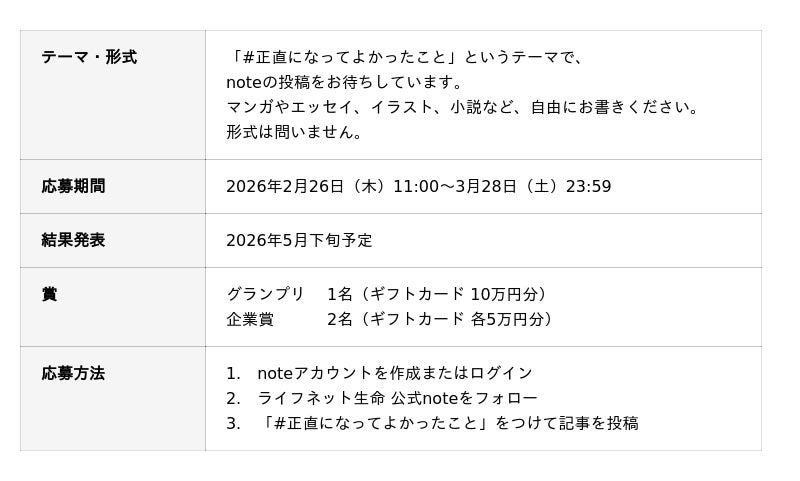 ライフネット生命保険株式会社 (URL:https://www.lifenet-seimei.co.jp/ 本社:東京都千代田区、代表取締役社長:横澤淳平)は、2026年2月26日から3月28日まで、noteでの投稿コンテスト「#正直になってよかったこと」を実施中です。