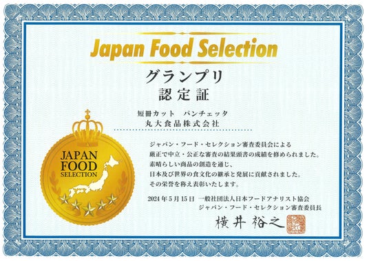 当社の「短冊カット パンチェッタ」は日本フードアナリスト協会主催の「ジャパン・フード・セレクション」にて2024年5月に最高評価のグランプリを受賞しました。