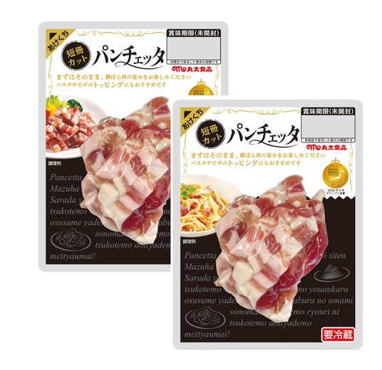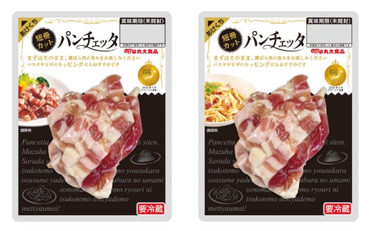 「食を通じて社会に貢献する企業」を目指す総合食品メーカー 丸大食品株式会社(本社:大阪府高槻市、社長:佐藤勇二)は、「短冊カット パンチェッタ」の商品デザインリニューアルを行います。当社のパンチェッタは短冊状にカット済みのため、手間なく、便利で使いやすい商品となっています。そのままお召し上がりいただくことはもちろん、パスタやピザのトッピングとしてご使用いただくこともおすすめです。商品デザインはおしゃれな雰囲気のシックなデザインとなっており、今回のデザインリニューアルではグランプリを受賞したジャパン・フード・セレクションのメダルを掲載することで品質をアピールするとともに、2種類(そのままでおつまみ・パスタのトッピング)の調理シズルを掲載することで、パンチェッタの食べ方訴求を行っていきます。