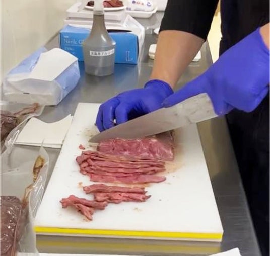 保健所、衛生協会といった外部の指導を受け、肉フェス独自の衛生管理マニュアルを設定していることが特徴の一つです。納品から在庫状態、加工調理方法、ご提供までを徹底管理します。同時にテナント全員に調理従事者の検便や毎日出勤時の体調管理を義務付けし、衛生協会指導員立会のもと手洗いや厨房施設の消毒などを検査します。また毎日2回商品を保管し、調理過程の芯温管理を行う検食も抜かりなく実施します。