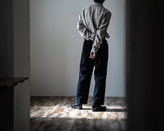 カバーオールジャケットのボディには、コットンリネンのプリペラ生地を採用しました。太番手の糸で構成された織り地は、表糸の浮き出しが強調されたもの。自然由来の素朴な質感が、生き生きと伝わってきます。衿には、コーデュロイを用いて、ジャケットを仕立てた後に製品染めを施しました。古典的なワークウェア・チョアジャケットと、ハンディングウェアの要素をミックス。ゆったりとしたサイジングで仕立てています。パンツも、ジャケットの衿と同じコーデュロイを採用。股上がやや深めであるため、ウエスト固定位置によってはノークションでも穿けるパンツです。染めは、敢えて色落ちのし易い顔料染めを施した後、予め色を落とす洗い加工を施しています。着古したヴィンテージのような、色濃淡やくったりとした生地に魅力が詰まっています。