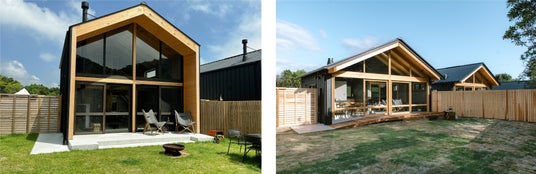 (左)ノルディックキャビン、(右)プライベートキャビン 部屋の前の庭はプライベートドッグランとしても