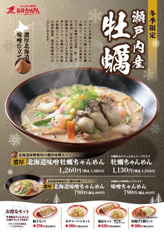 ちゃんぽんの良さとラーメンの良さを掛け合わせた ちゃんめん を看板メニューに西日本を中心に32 店舗を展開している「長崎ちゃんめん」では12 月5 日(木)から冬季限定ちゃんめんを発売いたします。まずは定番の牡蠣ちゃんめん。ぷりぷり大粒の瀬戸内産牡蠣3 個の食感と牡蠣の旨味がスープに溶け込んだコクのある海鮮の味をお楽しみください。また今年は北海道味噌を使用した牡蠣ちゃんめんも選べます。中辛口味噌の代表格「紅一点」を使用し濃厚味に仕立てております。沢山の野菜と牡蠣の旨味と濃厚な味噌味で、体の芯まで温めて、この寒い冬を乗り切りましょう。スタッフ一同、皆さまのご来店をお待ちしております。