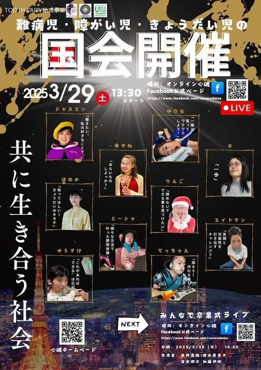 「【ワクワク・ドキドキ・感動】は全ての人に等しく与えられた権利である」を理念として活動を展開するNPO法人心魂プロジェクトは、当事者の子ども達10名が登壇する「難病児・障がい児・きょうだい児の国会」を開催します。この講演は2025年3月29日(土)にオンライン心魂Facebook公式ページで配信されます。登壇者は「共に生き合う社会」をテーマに、大人の意見ではなく、当事者の子ども達自身の心にあることを発表します。