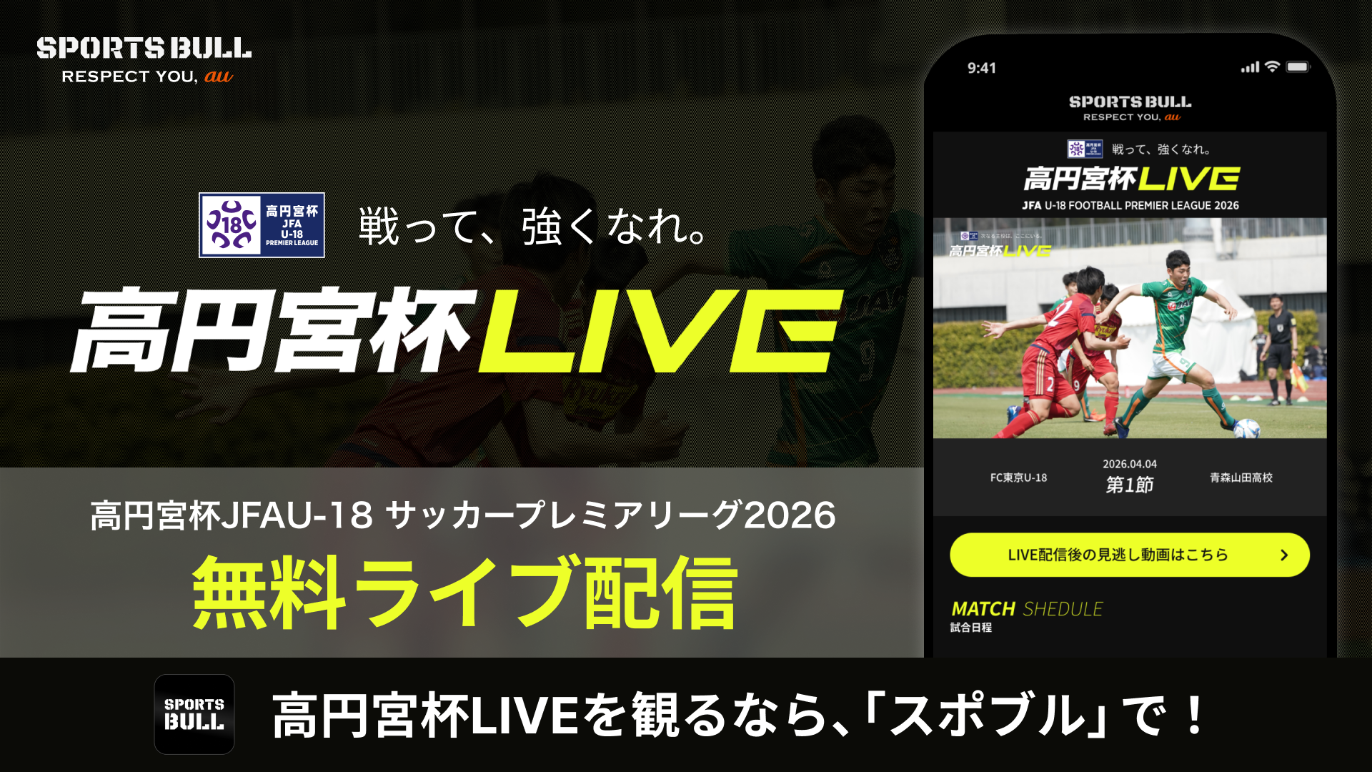 株式会社運動通信社(本社:東京都港区、代表取締役社長 CEO:若村 祐介、以下 運動通信社)は、KDDI株式会社(所在地:東京都港区、代表取締役社長 CEO:松田 浩路、以下 KDDI)と共同で運営するスポーツメディア「SPORTS BULL(スポーツブル)」内の特設ページ「高円宮杯LIVE」(https://sportsbull.jp/live/takamado-jfa-u18-premier/)にて、公益財団法人日本サッカー協会(本社:東京都文京区、会長:宮本 恒靖、以下 JFA)が主催する「高円宮杯 JFA U-18サッカープレミアリーグ 2026」を無料ライブ配信します。