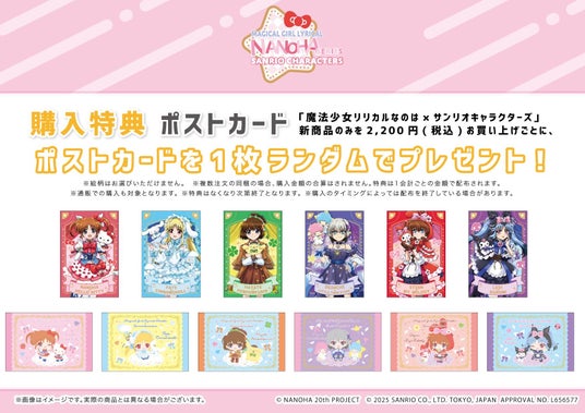 「魔法少女リリカルなのはシリーズ×サンリオキャラクターズ」新商品のみを1会計2,200円(税込)お買い上げごとに、購入特典としてポストカード(全12種)をランダムで1枚プレゼント。