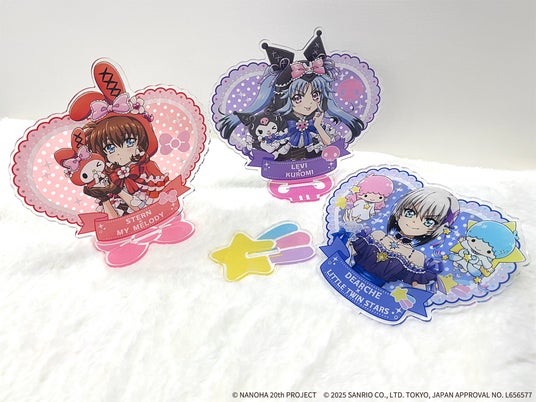 新作グッズには、「なのは×ハローキティ」「フェイト×シナモロール」「はやて×ポムポムプリン」「ディアーチェ×リトルツインスターズ」「シュテル×マイメロディ」「レヴィ×クロミ」のコラボペア6組が登場。