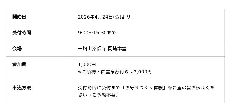 一畑山薬師寺では、2025年12月に名古屋別院で開始した「お守りづくり体験」が、開始から1ヶ月足らずで1,200体以上をお分けするなど大きな反響をいただいております。このたび、名古屋別院でのご好評を受け、2026年4月24日(金)より岡崎本堂においても正式にスタートいたします。