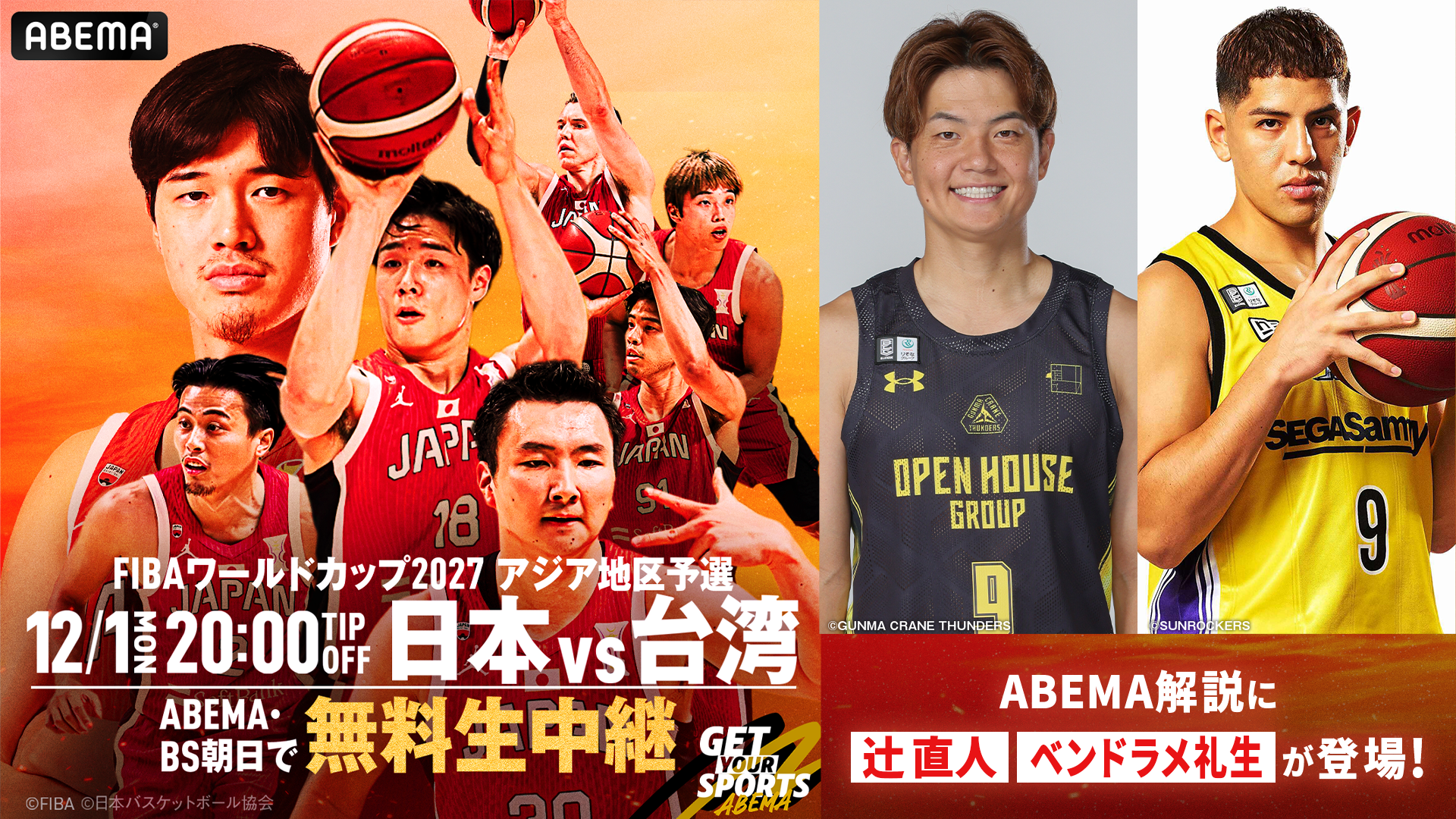 「ABEMA」、『男子バスケットボールFIBAワールドカップ予選 日本×台湾』にて現役Bリーガー・辻直人選手&ベンドラメ礼生選手の解説出演が決定