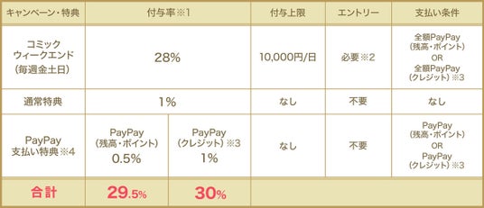 ・通常特典:毎日、ほぼすべての作品が対象で、PayPayポイント1%の特典を受けられます。付与上限はありません。