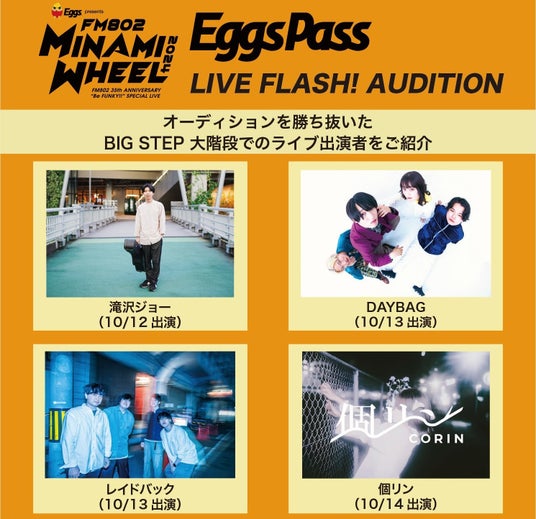 「Eggs presents FM802 MINAMI WHEEL 2024」フリーイベント「LIVE FLASH!」オーディション結果発表!滝沢ジョー、DAYBAG、レイドバック、個リンが出演決定!