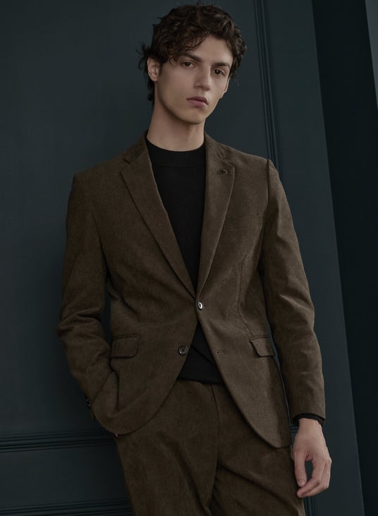 ベーシックなネイビーと秋カラーのカーキに、コーデュロイ生地で季節感を取り入れながらスーツやブレザーより気軽に着られるトレンドのアイテム。コーデュロイ生地は細畝でナチュラルな風合いに仕上げ、ワードローブに取り入れやすい仕様になっています。ジャケットラペルピンは英国国花のローズをモチーフに、さらに内側ポケットの中布にはKATHARINE HAMNETTのアーカイヴから採用したネクタイと同柄のマルチストライプパターンを使用し、細部までデザインにこだわりました。
