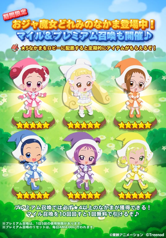 「どれみ」をはじめとした魔女見習いたちが「LINE ポコパンタウン」に大集合。今回は「通常服」と「魔女見習い服」の2つの衣装で登場します。なかま召喚やイベントクリア時、ログインボーナスなどさまざまなところで、なかまにできます。