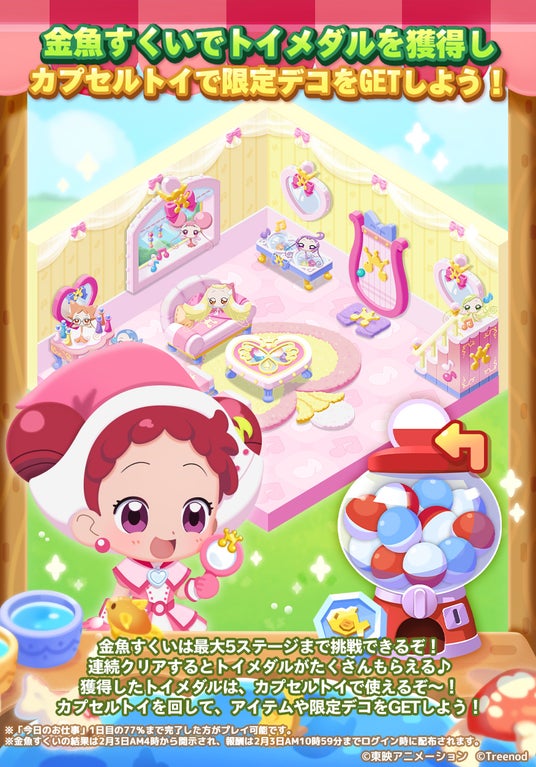 期間中、『おジャ魔女どれみ ドッカ~ン!』をモチーフとしたオリジナル屋内デコが13種類登場します。金魚すくいで「トイメダル」を集めてカプセルトイを回してコラボオリジナルデコを入手可能です。
