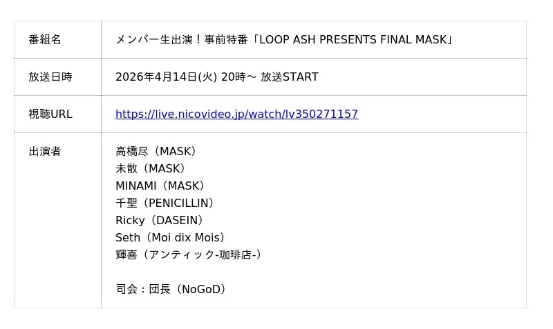 メンバー生出演!事前特番「LOOP ASH PRESENTS FINAL MASK」