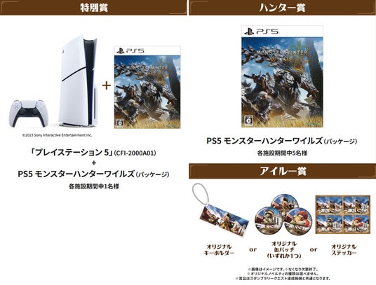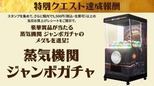 館内のラリーポイントでスタンプを集めるクエストにチャレンジしスタンプを集め、さらに館内で5,500円(税込・合算可)以上の当日お買上げレシートをご提示で『蒸気機関 ジャンボガチャ』にチャレンジ可能!「プレイステーション 5」(CFI-2000A01)+PS5 モンスターハンターワイルズ(パッケージ)やオリジナルグッズなどの豪華報酬をGETしよう!