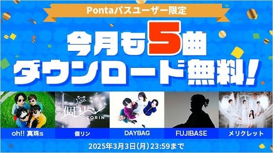 この企画は、Pontaパス会員を対象に1月21日(火)から実施している「あげすぎチャレンジ第2弾」キャンペーンの1つとして、通常は毎月1~2曲を無料ダウンロードのところ、5アーティスト同時に増曲して実施されるものです。