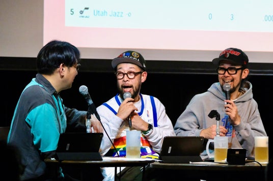 「ケビン・デュラントはもう1回、優勝はできるのか」も、盛り上がりを誘うお題となった。タツオさんが「あるとすれば今のサンズじゃないですか」としたのに対し、原選手は「優勝ですよね⋯あんまり想像できないです」と冷静な見方を示した。そこからタカヒロさんが「デュラントは優勝とかでやっていないから」というまるで関係者かのような物言いをすると、タツオさんから「お前、誰なんだよ!」というツッコミが入って、会場は大爆笑に包まれた。