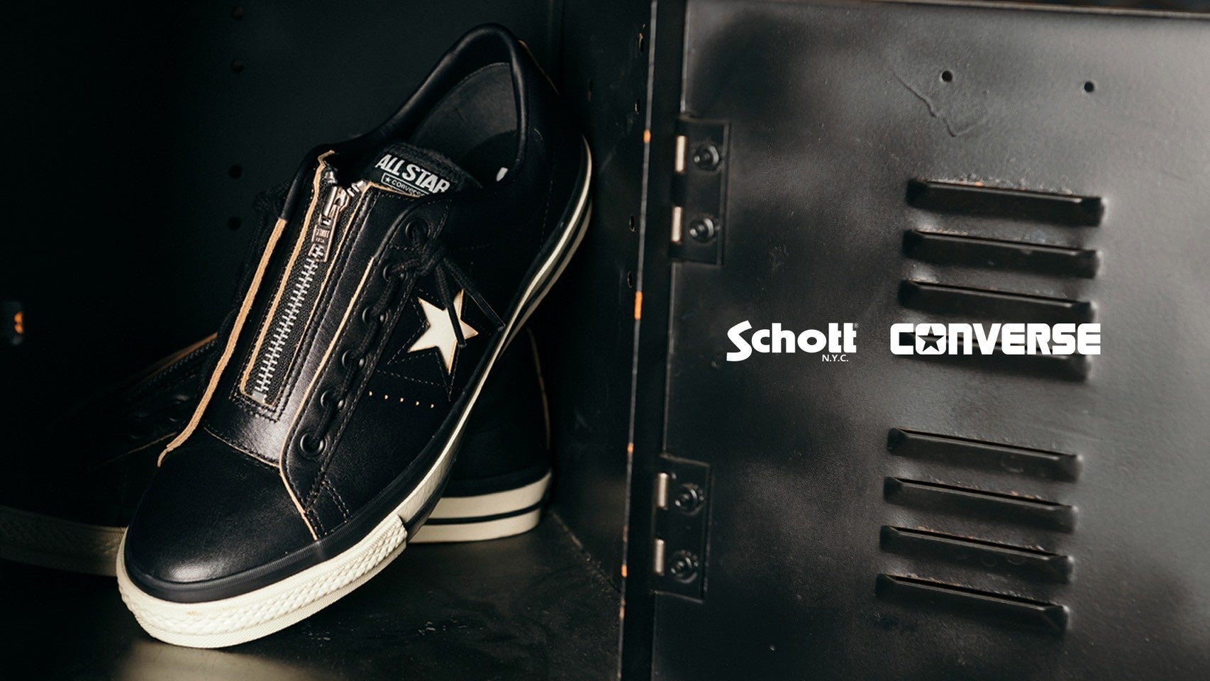 「Schott」のライダースジャケットの代名詞でもある通称”ワンスター”と「CONVERSE」を代表するアイコニックなモデル”ワンスター”のデザインディテールが融合したスペシャルモデルで、アッパーにはヴィンテージのライダースジャケットを想起させる茶芯レザーを採用。