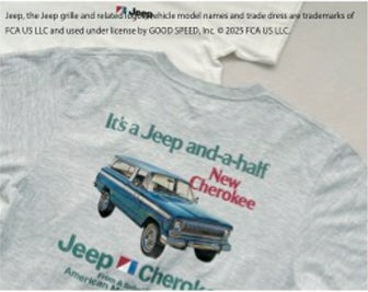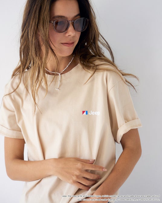 モデル着用 URL:https://x.gd/AWGM2 Jeep(R)のグラフィックをあしらったプリントTシャツとロゴキャップの2型を展開。
