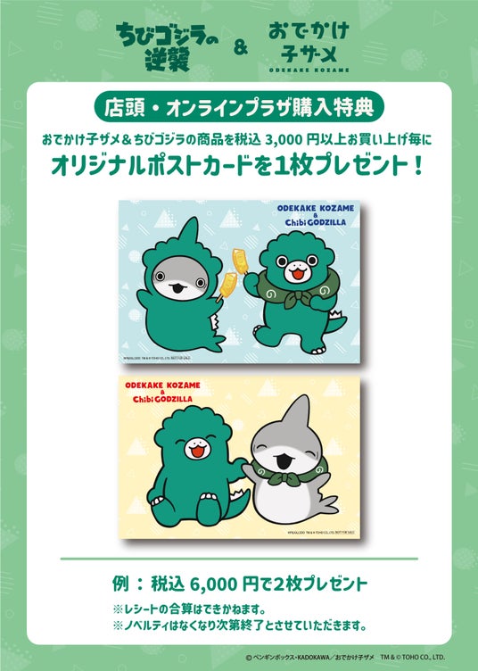 ちびゴジラの逆襲 & おでかけ子ザメ の商品を税込み3,000円お買い上げごとにオリジナルポストカードを1枚プレゼント!