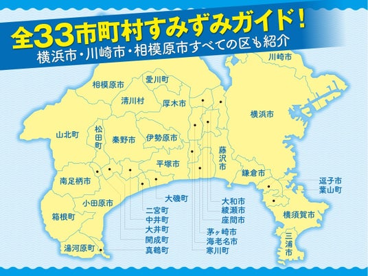 神奈川県33市町村・横浜市18区・川崎市7区・相模原市3区、すべてのまちのおすすめ特集を掲載!各市区町村のみどころ・グルメ・ショップ・イベントなども網羅した、まさに神奈川の大事典です。