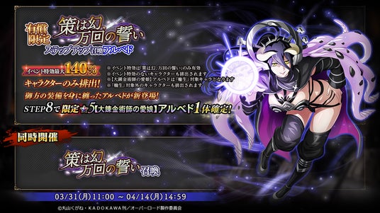 イベント詳細はゲーム内お知らせをご確認ください。 ■イベント召喚『有償限定策は幻、万回の誓いステップアップ召喚-アルベド-』開催!