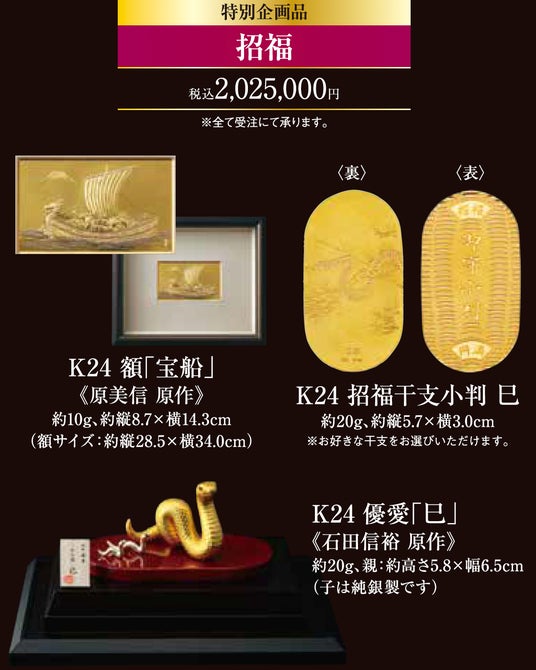 今回の「大黄金展」には特別展示として、サッカー漫画の金字塔ともいえる作品『キャプテン翼』の主人公・大空翼が等身大の黄金像になった「金箔CAPTAIN TSUBASA」が関西に初登場します。作者の高橋陽一先生の監修のもと制作された本作品は、金箔を約900枚使用し、翼くんが躍動感のある姿で黄金色に輝いています。また同時に置物サイズである「K24 CAPTAIN TSUBASA」(約80g、税込4,312,000円)も展示販売します。