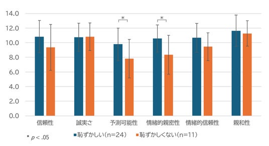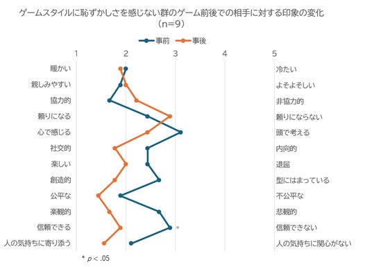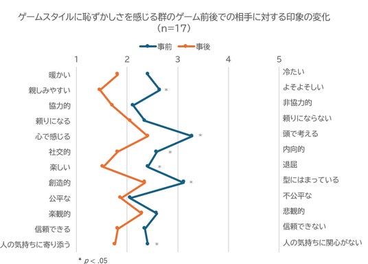 恥ずかしいが高い群では、ゲーム後の対戦相手に対して、「親しみやすい」「心で感じる」「社交的」「楽しい」「創造的」「人の気持ちに寄りそう」の6項目に関して、肯定的な印象へと変化した。一方で、恥ずかしいが低い群では、肯定的な印象へと変化したのは「信頼できる」のみとなっている。(有意確率 <.05)