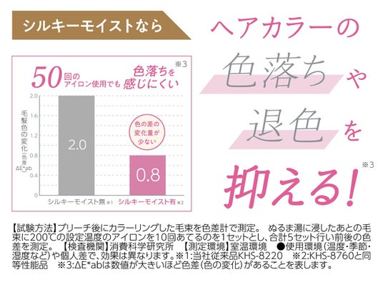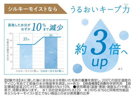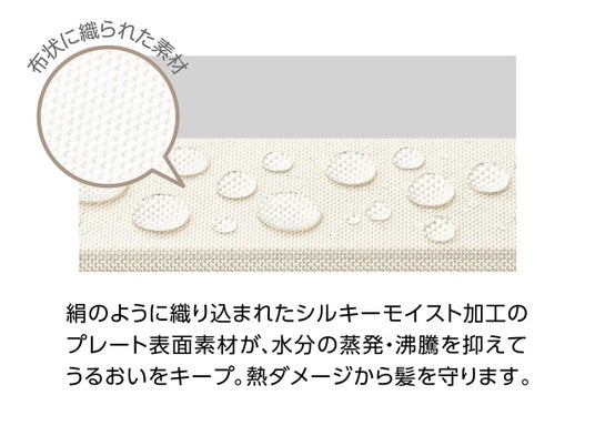 ・プレートは熱ダメージから髪を守る「シルキーモイスト加工」を採用。水分の蒸発・沸騰を抑えてうるおいをキープ。