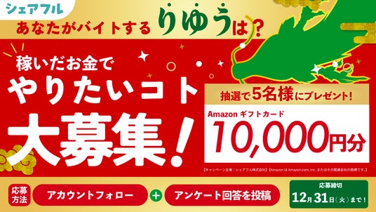 「アルバイト応援!シェアフル年末キャンペーン」キャンペーンは2024年12月26日(木)~2024年12月31日(火)までの期間中に応募条件を満たした方の中から抽選で5名様に1万円分のAmazonギフトカードが当たるキャンペーンです。この機会にぜひご参加ください。