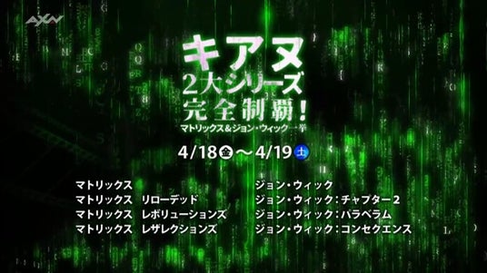 映画史に残るSFアクション第1弾『マトリックス』、マトリックスの真実を上回る驚愕の真相が明らかに!シリーズ第2弾『マトリックス リローデッド』、現実世界で籠城戦!仮想世界ではエージェント・スミスとの最終対決!『マトリックス レボリューションズ』、18年ぶりに復活したSFアクションシリーズ第4弾『マトリックス レザレクションズ』、復讐に燃える伝説の殺し屋の“ガン・フー”が炸裂!キアヌ・リーヴスが完全復活!『ジョン・ウィック』、最強殺し屋の一撃必殺アクションが進化!キアヌ・リーヴスの魅力全開シリーズ第2弾『ジョン・ウィック:チャプター2』、裏社会を追われた伝説の殺し屋の運命は?キアヌ・リーヴス主演のシリーズ第3弾『ジョン・ウィック:パラベラム』、伝説の殺し屋が最大の死闘に挑む!大ヒットアクションシリーズ第4弾『ジョン・ウィック:コンセクエンス』の全8作品を4月18日(金)、19日(土)の期間に放送。