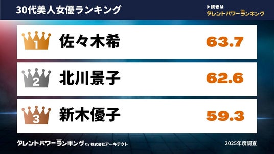 『タレントパワーランキング』では、タレントパワーランキングに登録されている「ビジュアルが良い」イメージを持たれているなかでも、2026年1月20日時点で20代・30代・40代の女優のスコアを調査。