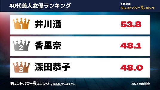 40代では、2025年11月に公開された堺雅人主演の映画『平場の月』でヒロイン役を演じた女優が1位にランクイン。