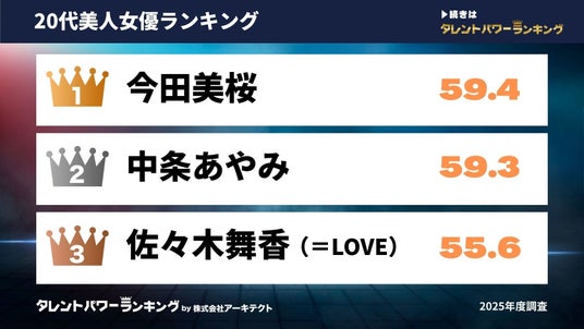 20代では、2025年前期NHK連続テレビ小説『あんぱん』でヒロインを演じた女優が1位にランクイン。